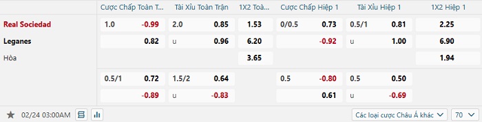 Bảng tỷ lệ kèo bóng đá Real Sociedad vs Leganes