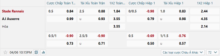 Bảng tỷ lệ kèo bóng đá Rennes vs Auxerre