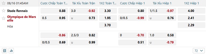 Soi kèo châu Á, kèo Rennes vs Marseille
