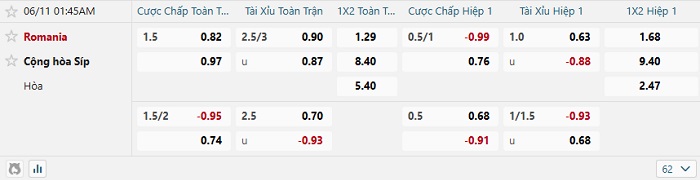 Bảng tỷ lệ kèo bóng đá hôm nay Romania vs Síp