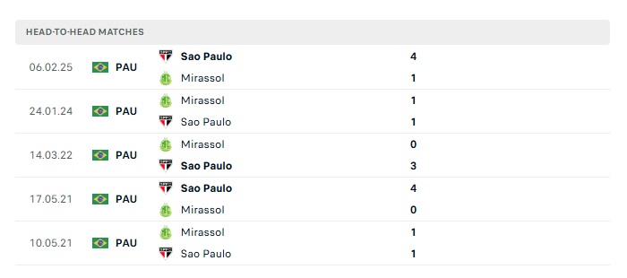 Lịch sử đối đầu Sao Paulo vs Mirassol