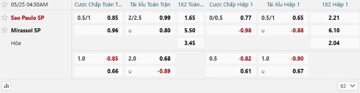 Bảng tỷ lệ kèo nhà cái Sao Paulo vs Mirassol