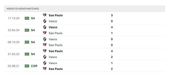 Lịch sử đối đầu Sao Paulo vs Vasco DG