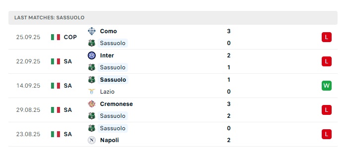 - Phong độ gần đây Sassuolo