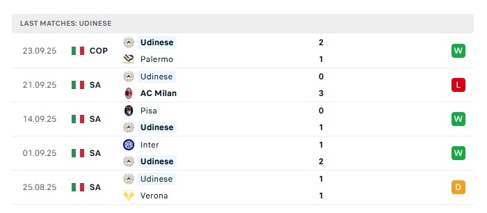 - Phong độ gần đây Udinese