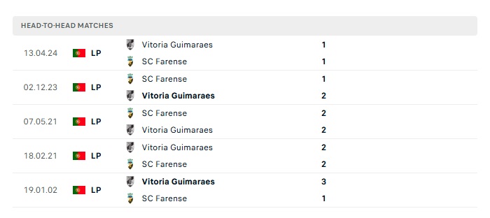 Lịch sử đối đầu SC Farense vs Vitoria Guimaraes