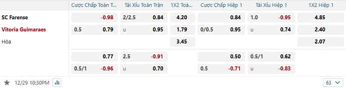 Bảng tỷ lệ kèo bóng đá SC Farense vs Vitoria Guimaraes