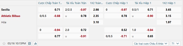 Bảng tỷ lệ kèo bóng đá Sevilla vs Athletic Bilbao