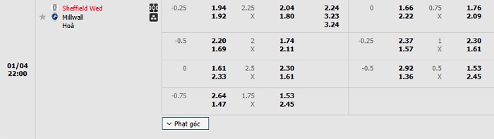 Bảng tỷ lệ kèo bóng đá Sheffield Wed. vs Millwall