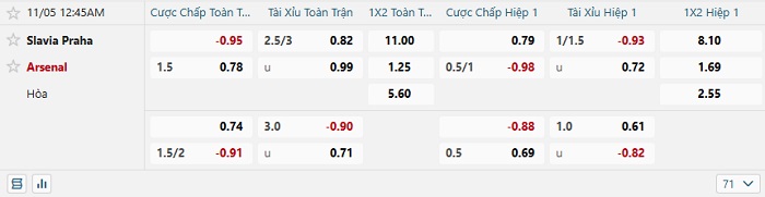 - Kèo tỷ số H1 Slavia Praha vs Arsenal: 0-1