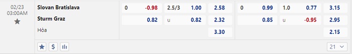 Bảng tỷ lệ kèo bóng đá Slovan Bratislava vs Sturm Graz