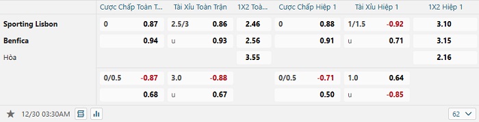 Bảng tỷ lệ kèo bóng đá Sporting Lisbon vs Benfica