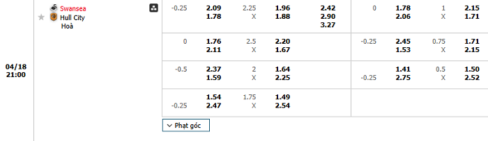 Bảng tỷ lệ kèo nhà cái Swansea City vs Hull City