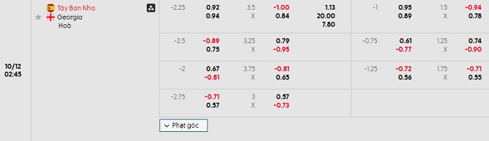 Bảng tỷ lệ kèo bóng đá Tây Ban Nha vs Georgia