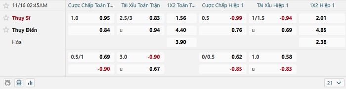 - Kèo tỷ số H1 Thụy Sỹ vs Thụy Điển: 1-0