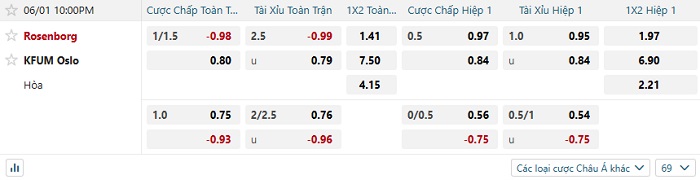 Tip kèo Châu Á hiệp 1 Rosenborg vs Oslo
