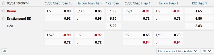 Tip kèo Châu Á full trận Brann vs Kristiansund