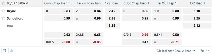 Tip kèo Châu Á hiệp 1 Bryne vs Sandefjord