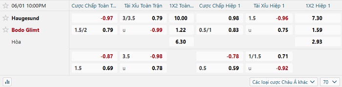 Tip kèo Châu Á hiệp 1 Haugesund vs Bodo Glimt