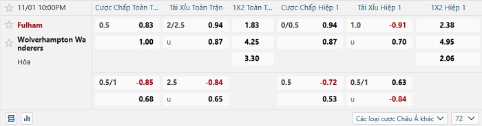 Tip kèo Châu Á hiệp 1 Fulham vs Wolves