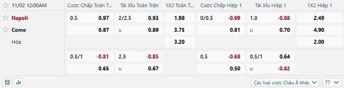 Tip kèo Châu Á hiệp 1 Napoli vs Como
