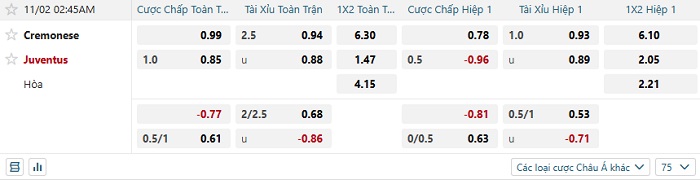 Tip kèo Châu Á hiệp 1 Cremonese vs Juventus
