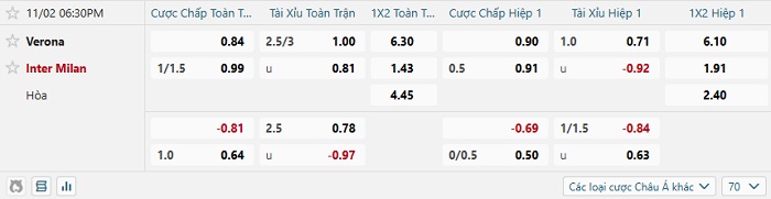 Tip kèo Châu Á full trận Verona vs Inter