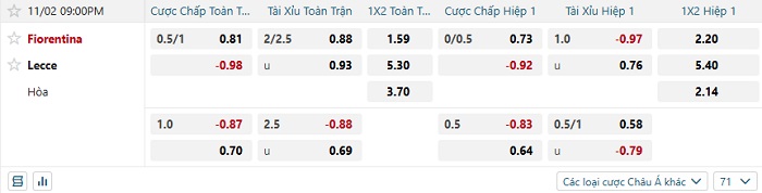 Tip kèo Châu Á hiệp 1 Fiorentina vs Lecce