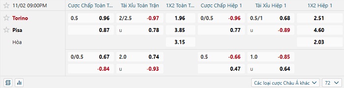 Tip kèo Châu Á full trận Torino vs Pisa