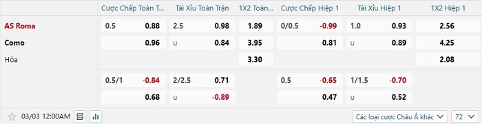 Tip kèo Châu Á hiệp 1 Roma vs Como