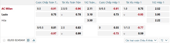 Tip kèo Châu Á hiệp 1 Milan vs Lazio