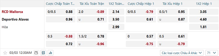 Tip kèo Châu Á hiệp 1 Mallorca vs Alaves