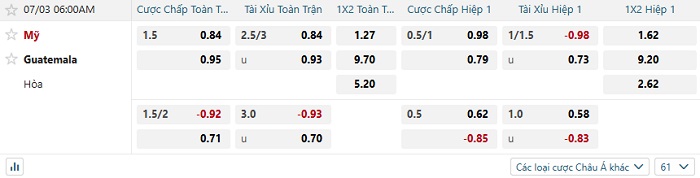 Tip kèo Châu Á full trận Mỹ vs Guatemala