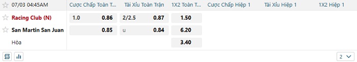 Tip kèo Châu Á full trận Racing Club vs San Martin San Juan