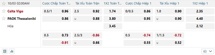 Tip kèo Châu Á hiệp 1 Celta Vigo vs PAOK