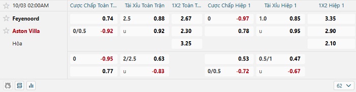 - Dự đoán tỷ số hiệp 1: Feyenoord 0 – 0 Aston Villa
