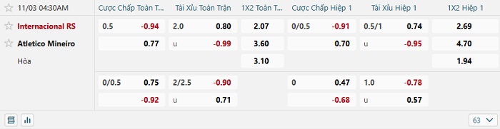 Tip kèo Châu Á full trận Internacional vs Atletico Mineiro