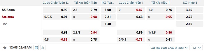Tip kèo Châu Á hiệp 1 Roma vs Atalanta