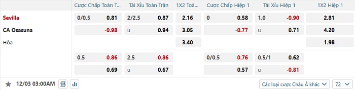 Tip kèo Châu Á hiệp 1 Sevilla vs Osasuna