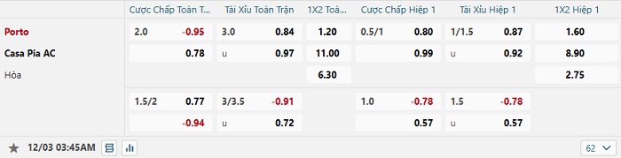 Tip kèo Châu Á hiệp 1 Porto vs Casa Pia