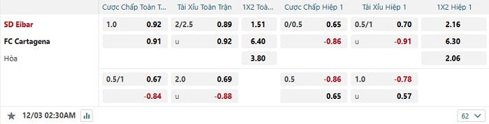Tip kèo Châu Á hiệp 1 Eibar vs Cartagena