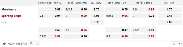 - Dự đoán tỷ số hiệp 1: Moreirense 0 – 0 Braga