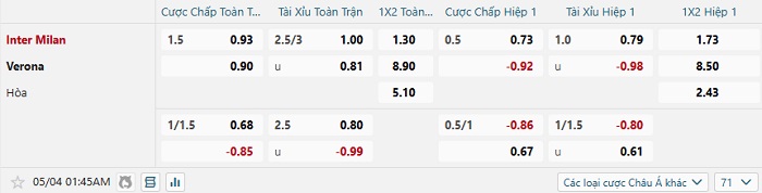 Tip kèo Châu Á hiệp 1 Inter vs Verona