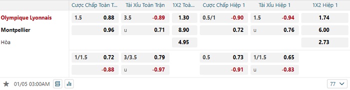 Tip kèo Châu Á hiệp 1 Lyon vs Montpellier