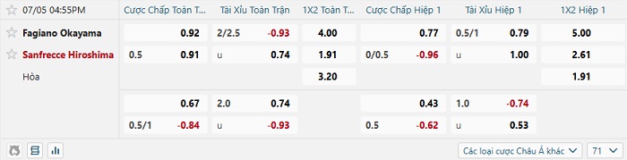 Tip kèo Châu Á hiệp 1 Fagiano Okayama vs Sanfreece Hiroshima