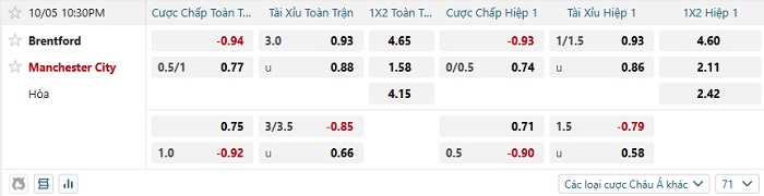 Tip kèo Châu Á hiệp 1 Brentford vs Man City