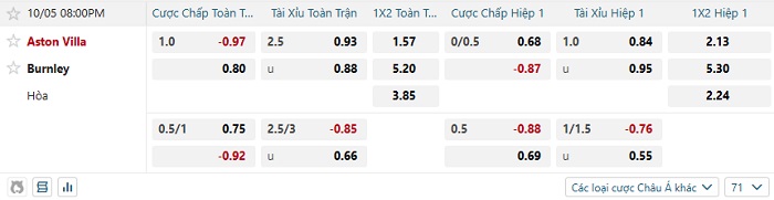 Tip kèo Châu Á hiệp 1 Aston Villa vs Burnley