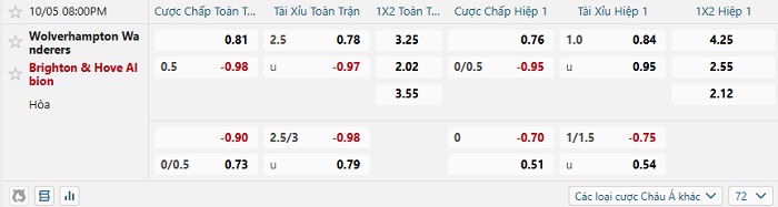 Tip kèo Châu Á full trận Wolves vs Brighton
