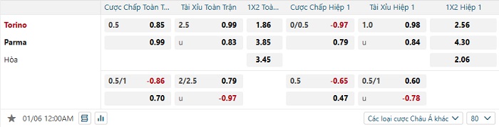 Tip kèo Châu Á hiệp 1 Torino vs Parma