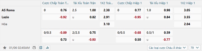 Tip kèo Châu Á hiệp 1 Roma vs Lazio
